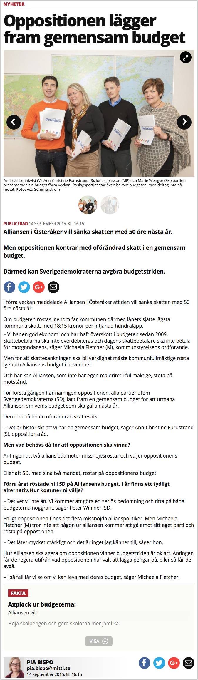 Lokaltidningen Mitt i Södra Roslagen skriver i veckans nummer om vår gemensamma budget med S, MP och Skolpartiet för 2016.
