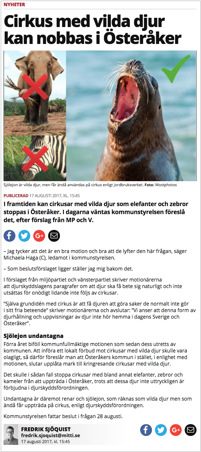 I veckans nummer skriver lokaltidningen Mitt i Södra Roslagen om vår motion om att Österåkers kommun i framtiden ska neka cirkusar med vilda djur att besöka kommunen.