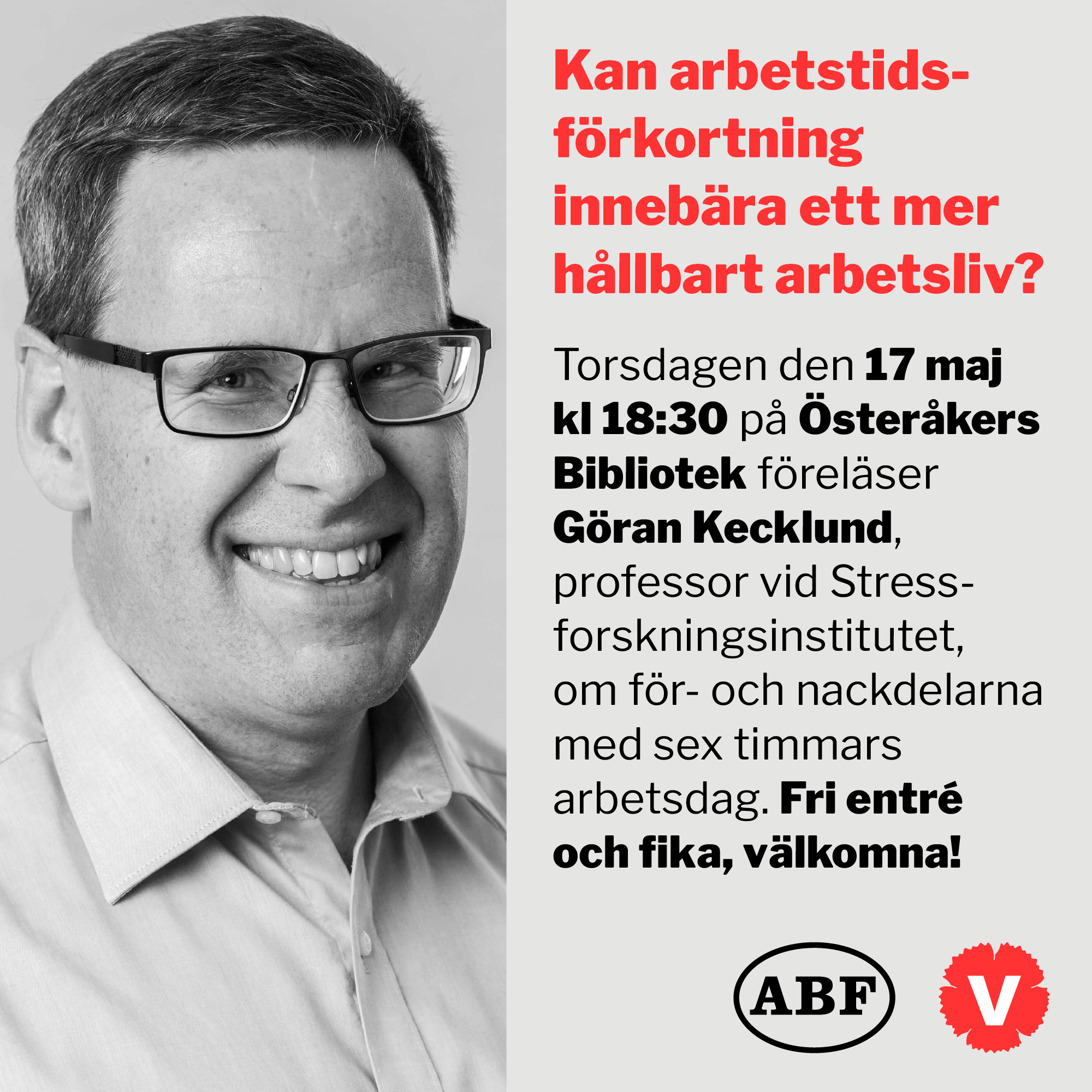 I samband med Vänsterpartiet Österåkers motion om att införa 6 timmars arbetsdag på försök inom kommunal äldreomsorg så har vi bjudit in Göran Kecklund, professor vid Stressforskningsinstitutet (Stockholms Universitet) till att föreläsa om stressforskning kring arbetstidsförkortning. Föreläsningen sammanfattar kunskapsläget när det gäller arbetstidsförkortning, hälsa, stress och återhämtning. Föreläsningen kommer att bl.a. besvara frågor som: